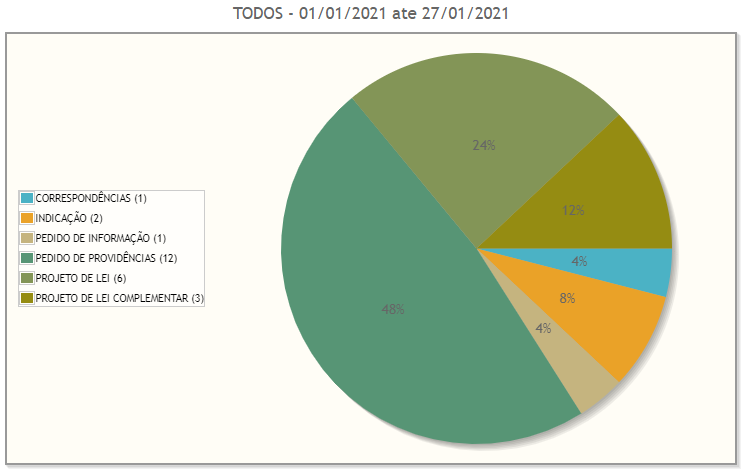 Em essência, a função dos vereadores é de fiscalizar o trabalho da administração pública municipal e propor projetos de lei. É certo que avaliar o trabalho dos parlamentares em números não é o caminho mais correto, muito embora seja uma medida de valor sobre a direção que tem dado ao próprio mandato. Para isso, conforme o gráfico a seguir, é possível mensurar o conjunto de proposições do mês de janeiro deste ano: