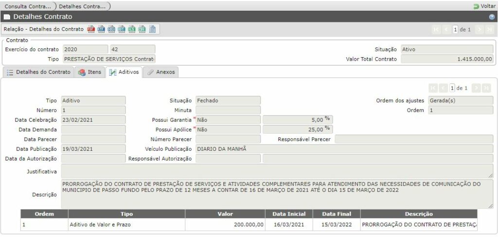 Acima: o contrato atual da prefeitura com a agência foi aditivado recentemente, com validade para o período de 16 de março de 2021 até 15 de março de 2022. O valor previsto para o gasto em “propaganda” é de R$ 1,4 milhão.