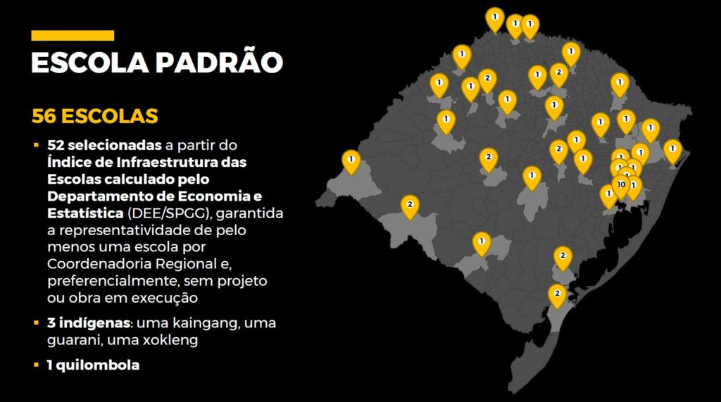 Acima: dinâmica e cidades das escolas escolhidas para integrarem o programa “Escola Padrão”, segundo documentação do Governo RS.