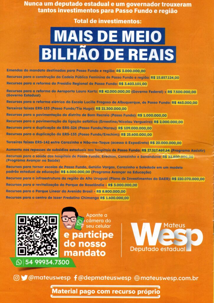 Passo Fundo recebeu um impresso do deputado estadual Mateus Wesp na última semana. De título “Prestação de Contas (2019-2022) – O Trabalho do Deputado que Trouxe Mais de Meio Bilhão de Reais para Passo Fundo e Região”, o panfleto amarelinho de 10 páginas apareceu na caixa de correio de muita gente na cidade.