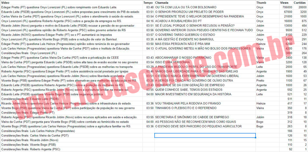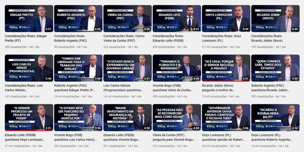 Os cortes do segundo ao quarto lugar também são identificados com Lorenzoni, obtendo 67 mil, 21 mil e 16 mil visualizações. Até nos vídeos de “considerações finais” o candidato do PL ficou na frente: 3800 contra 511 de Eduardo Leite.