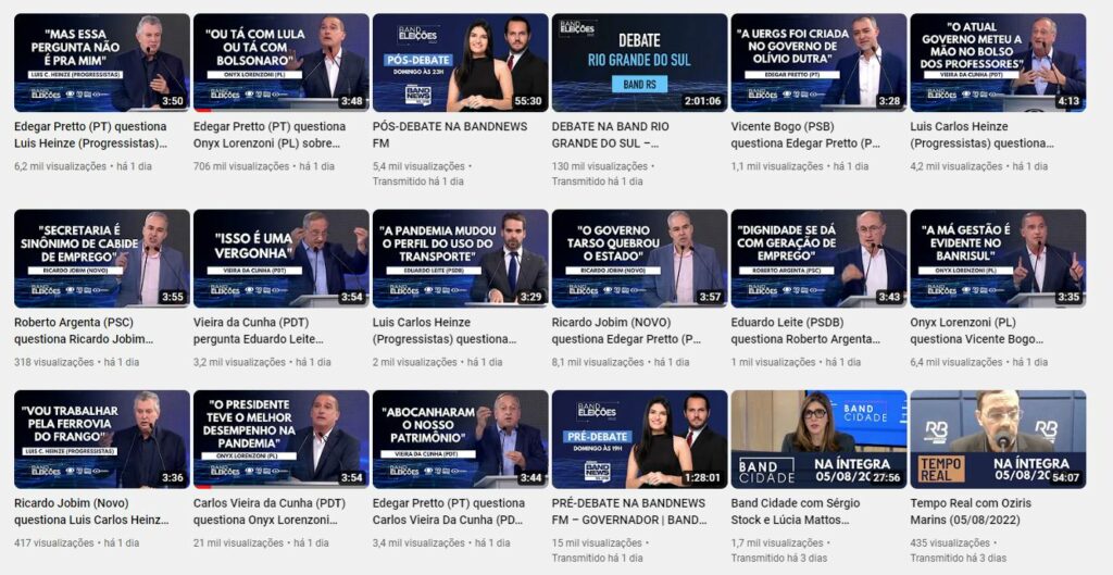 A Band postou cerca de 30 cortes após o evento e a diferença de visualizações entre eles é gritante, com grande predomínio dos vídeos favoráveis a Bolsonaro. Foram 24 destaques do debate e 8 considerações finais. O vídeo mais visto até o momento da edição deste texto foi o “Edegar Pretto (PT) questiona Onyx Lorenzoni (PL) sobre rompimento com Eduardo Leite”, com 706 mil visualizações, 28 mil curtidas e 3.865 comentários. Apesar de ser o “momento” do candidato petista perguntar ao bolsonarista, a “miniatura” que divulga o corte mostra Onyx com a frase “Ou tá com Lula ou tá com Bolsonaro”.