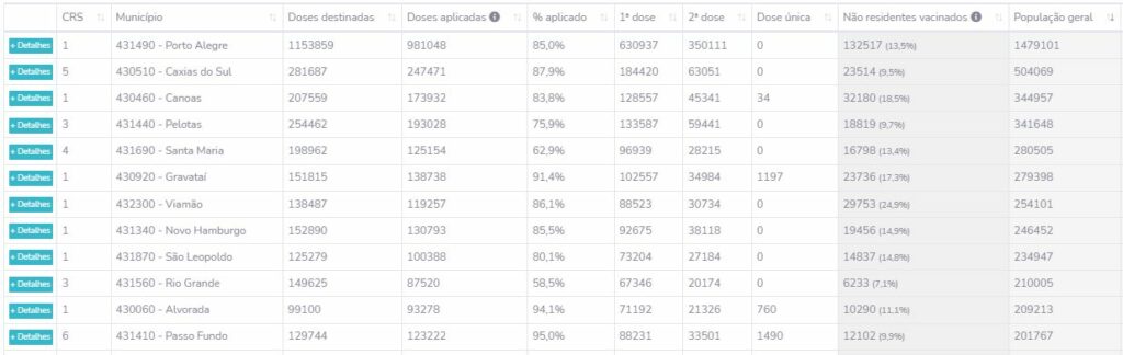 O Painel do Governo RS mantém um “tabelão” atualizado em tempo real sobre a vacinação nos municípios gaúchos, doses enviadas, primeiras doses, segundas e a porcentagem da população que recebeu a vacina. É daí que sai o ranking.
