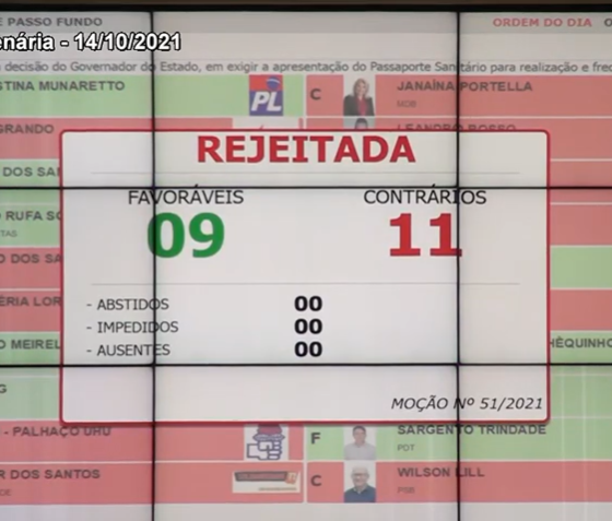 Na Sessão Plenária do dia 14 de outubro, na Câmara de Vereadores de Passo Fundo, os parlamentares apreciaram a Moção 51/2021, de autoria do gabinete do vereador Renato Orlando Tiecher (Tchequinho) (PSC), de repúdio contra a decisão do Governador do Estado em exigir a apresentação do Passaporte Sanitário para realização e frequência em eventos. A proposição foi rejeitada por 11 votos a 9.
