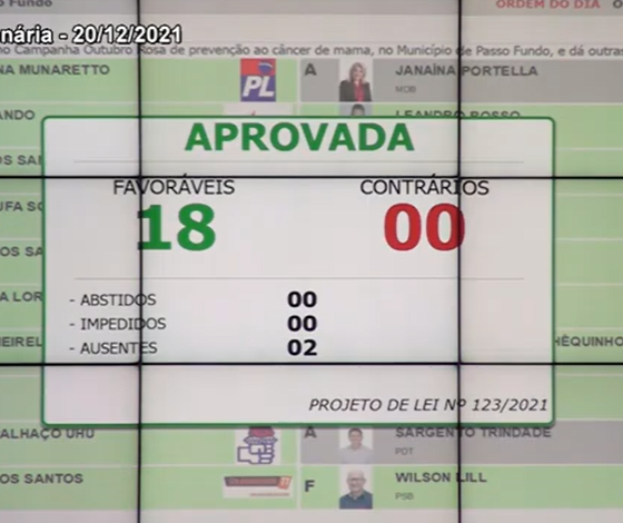 Aprovado o Projeto de Lei nº 123, de autoria da vereadora Janaína Portella (MDB), que institui o mês de Outubro como Campanha Outubro Rosa de prevenção ao câncer de mama, no Município de Passo Fundo. O objetivo é oficializar no município, a cultura de que se deve buscar a divulgação mais ampla possível, sobre o câncer de mama.
