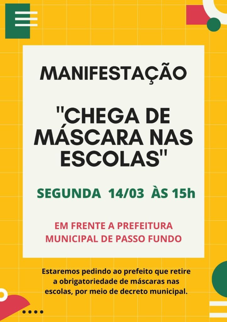 Hoje, em Passo Fundo, às 15h, haverá manifestação pedindo o fim do uso obrigatório das máscaras nas escolas. Veja: